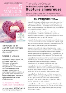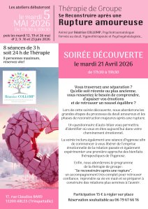 ACTU >>> Un thérapie de groupe « Se reconstruire après une rupture amoureuse » débutera le mardi 5 mai 2026 pour 8 séances de 3 h les mardis de mai et juin 2026 de 17h30 à 20h30 à ARLES (Trinquetaille)
